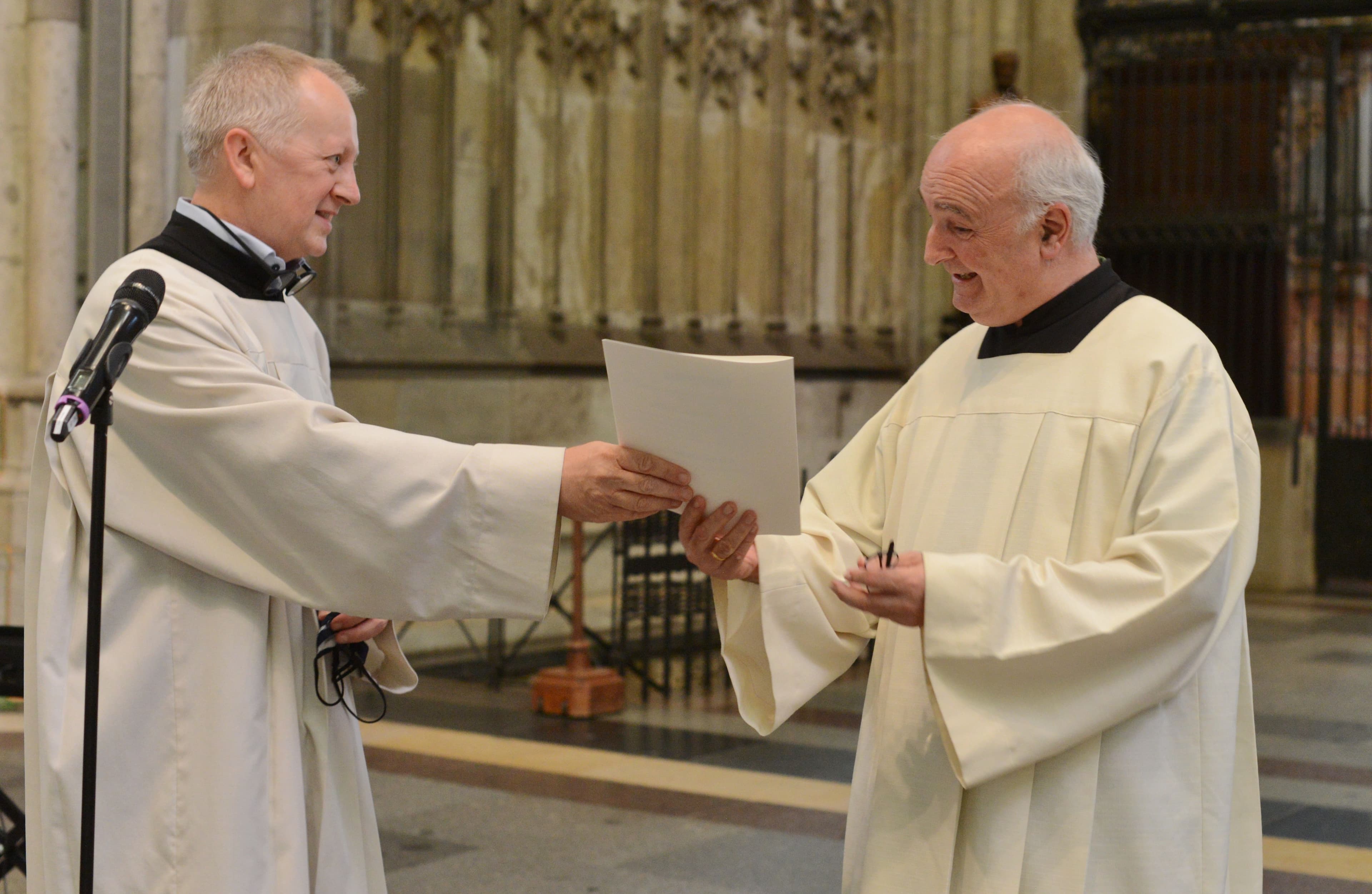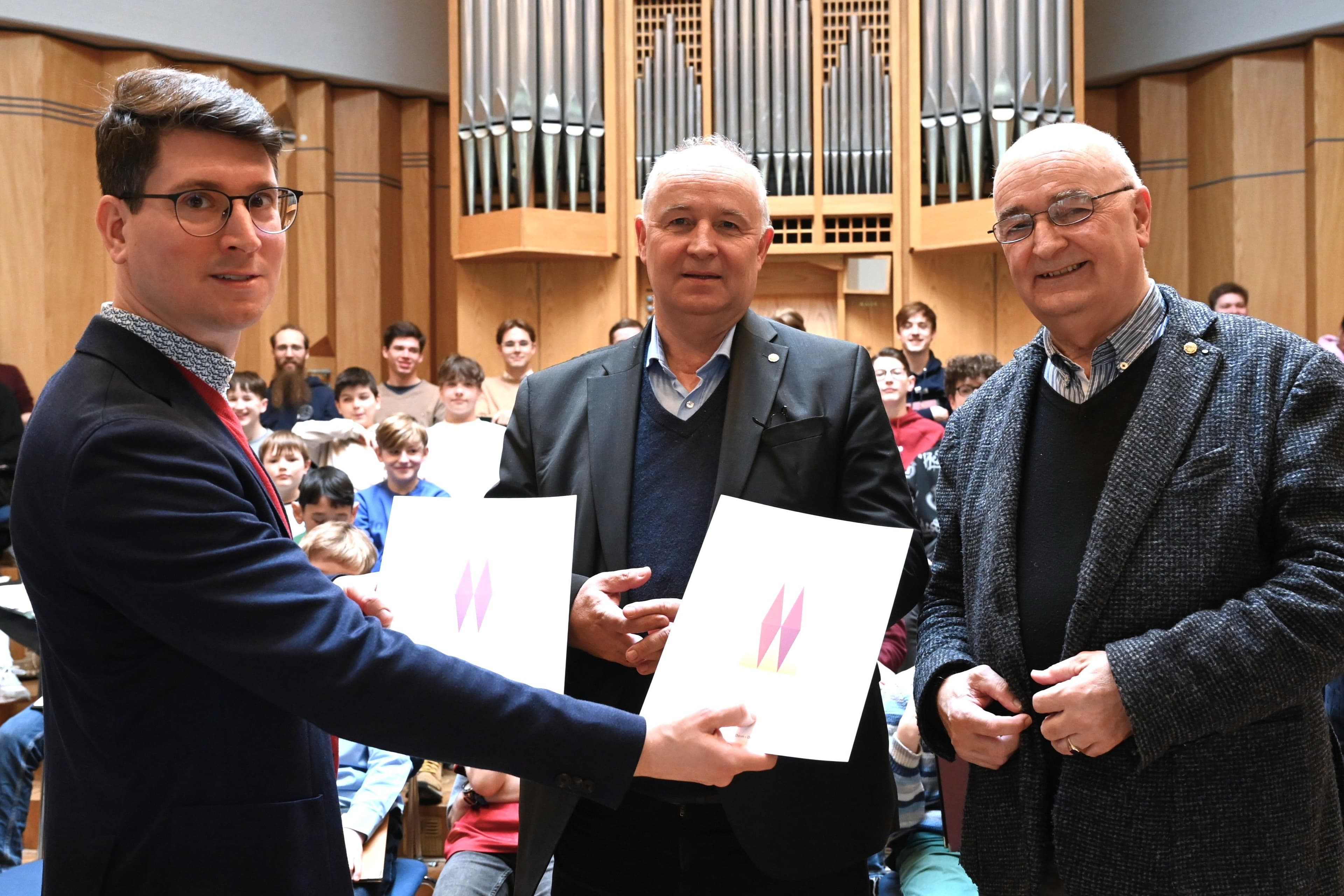 Eine besondere Ehre für Gregor und Ingbert Mühe: Nach einer Chorprobe überreichte Domkapellmeister Alexander Niehues den beiden Brüdern eine Urkunde des Diözesan-Cäcilienverbandes und ein persönlich unterzeichnetes Glückwunschschreiben von Erzbischof Kardinal Woelki zu diesem außergewöhnlichen Jubiläum. In beidem kommt eine große Dankbarkeit für einen solchen jahrzehntelangen Dienst „zum Lobpreis Gottes“ zum Ausdruck – in Anerkennung ihrer Verdienste um die „Verkündigung des Glaubens in der Liturgie“.